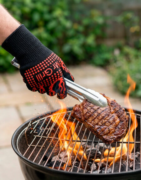 Guantes protectores de fuego Mr. Grill, fabricados con aramida resistente y tiras de silicona antideslizantes para un agarre seguro. Ofrecen protección térmica eficaz al manipular objetos calientes, soportando altas temperaturas por periodos cortos. Cuentan con diseño de muñeca larga y forro interno de algodón para mayor comodidad y seguridad en la cocina o parrilla.